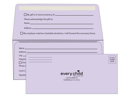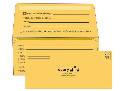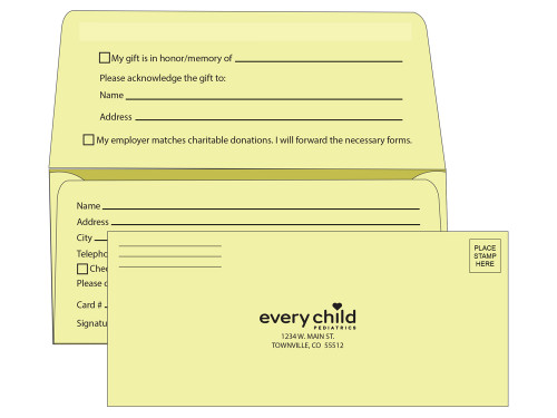 Personalize your remittance envelopes with your nonprofit logo, mailing address, and other artwork. To complete your order, upload your logo to the website, select your color, and add to cart. Pair your selected color envelope with traditional black ink, to make your logo and text pop off the page.